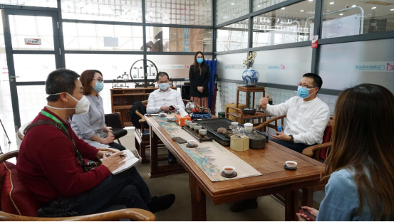 南国小商品城常务副总经理梁展鹏(右二)介绍复工复业情况